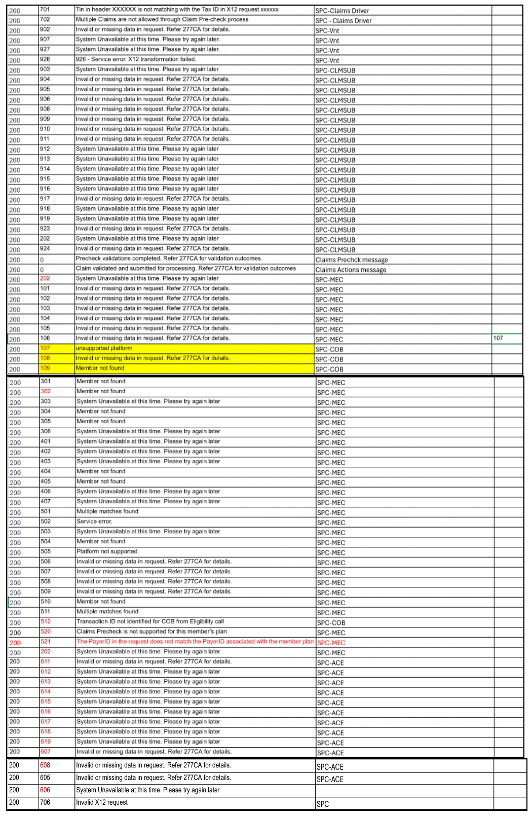 The following table provides error codes, including code values, messages, and troubleshooting guidance.