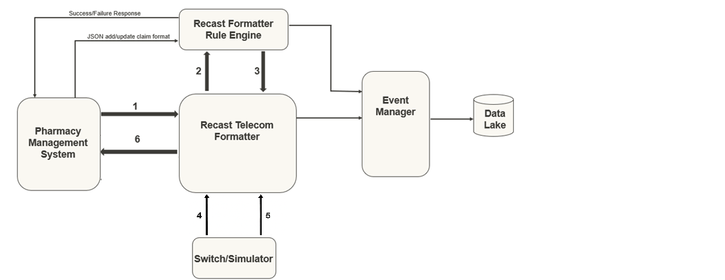 - Telecom Formatter uses the format details from Formatter Rule Engine and formats the claim and responds to the Pharmacy Management System with the formatted claim.